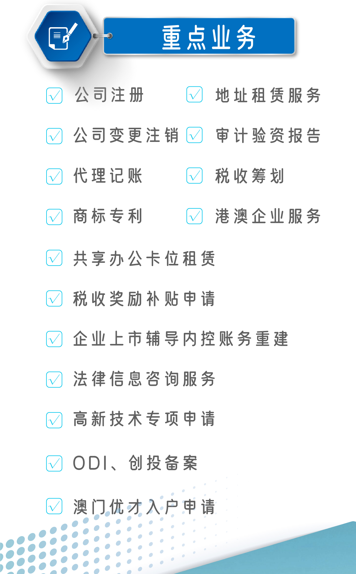 公司汇集了拥有专业知识和丰富实践经验的工商、会计咨询、税务等方面的中高级专业人才,并与工商、税务、银行及政府部门等建立了非常密切的合作关系,可为中小企业提供工商注册、注册地址、验资、会计咨询、财务咨询、记账代理、税务、审计咨询、年检变更、进出口权、食品流通许可证、等全方位一条龙专业服务,与客户同发展,共进步。
